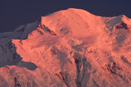 Sunset provides alpine glow on Denali’s north peak and Wickersham Wall as seen from Wonder Lake.
