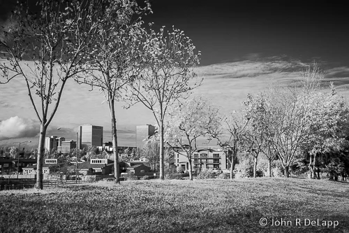 These images were created using a digital camera that has been modified to capture infrared (IR) light. There is normally a filter in front of the sensor in all digital cameras that blocks IR light since all sensors are sensitive to IR. This filter is removed and replaced with a filter that allows varying degrees (depending on the filter) of IR light to penetrate and reach the sensor. Slight adjustments (or bracketing) in exposure and focus are usually required when using an IR modified camera. IR penetrates atmospheric haze and produces dramatic foliage, clouds, and sky in landscapes. A variety of stunning B&W images and “false-color” images can be made with these cameras. IR can also be used in portraiture which will yield soft, blemish free skin. Modifying a digital camera can be done by several companies and the one I have used for my cameras is Life Pixel located in the Seattle area.
